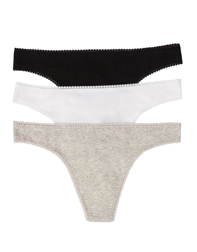 The On Gossamer Cabana Cotton Hip G 3-Pack Thong is a great choice for everyday. The thong style panty is made of super soft and ultra lightweight fabric. The rise is low, falling flatteringly below the waist. The thong back is minimal coverage, making it a great choice under any outfit. There’s delicate crochet trim for pretty detail along the waist and legs. This thong comes in a convenient 3 pack for an easy option almost half the week.